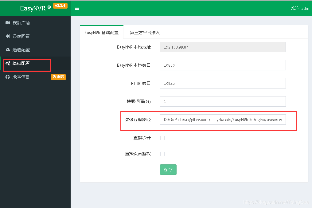 我们在登陆EasyNVR界面的时候,可以看到EasyNVR自身有对应的录像路径配置界面;